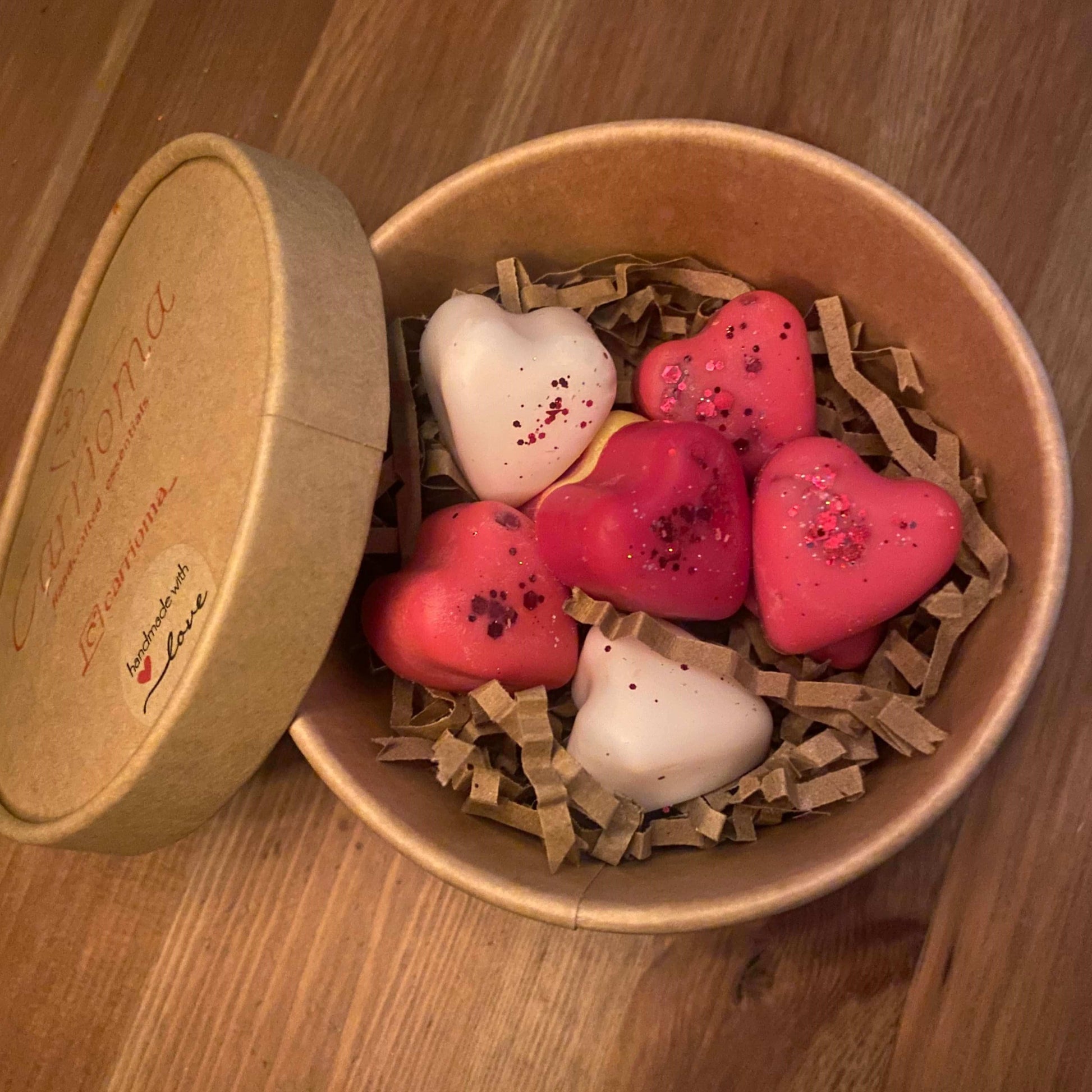 Χειροποίητα wax melts σε σχήμα καρδιάς από φυτική σόγια. Σε mix κόκκινου & λευκού χρώματος.
