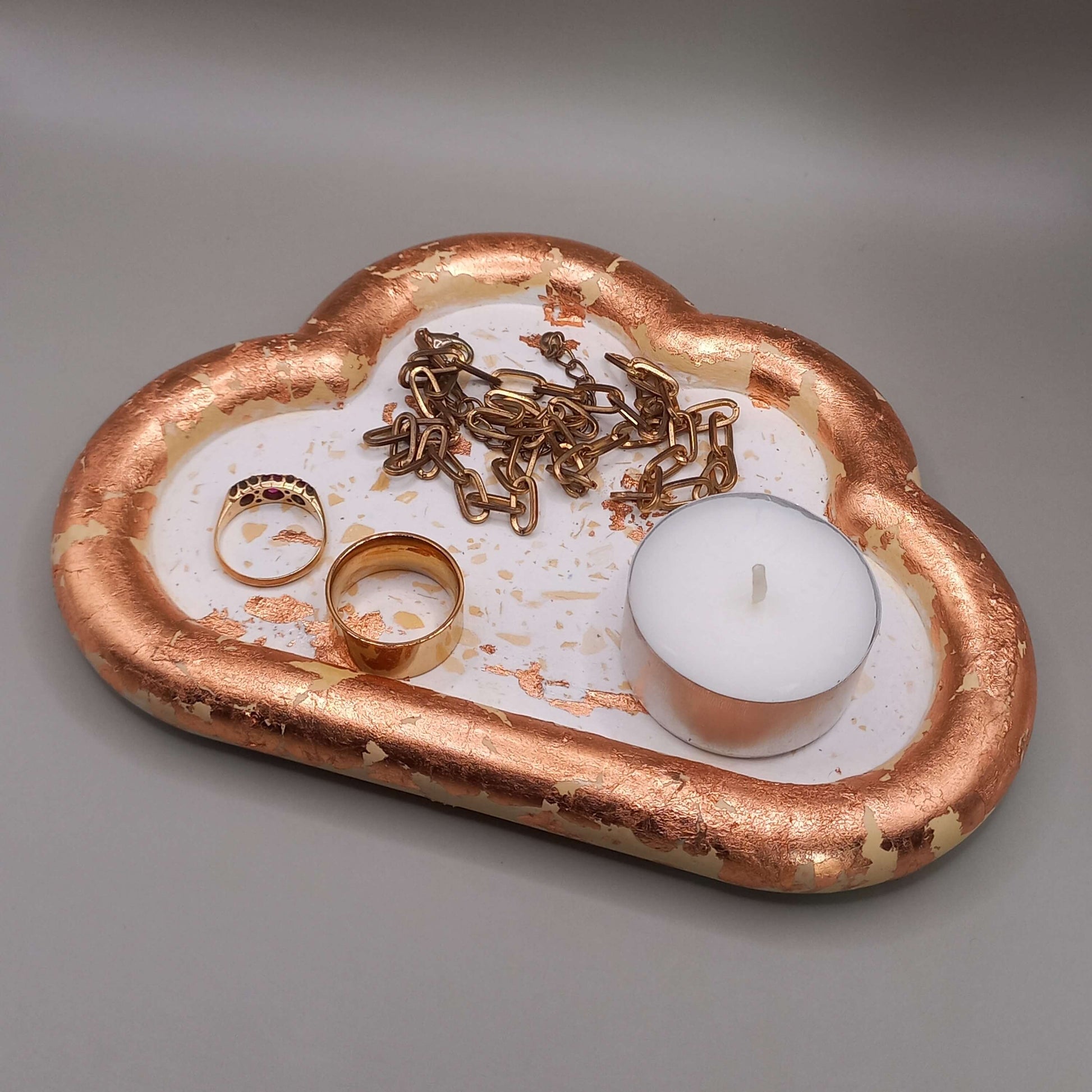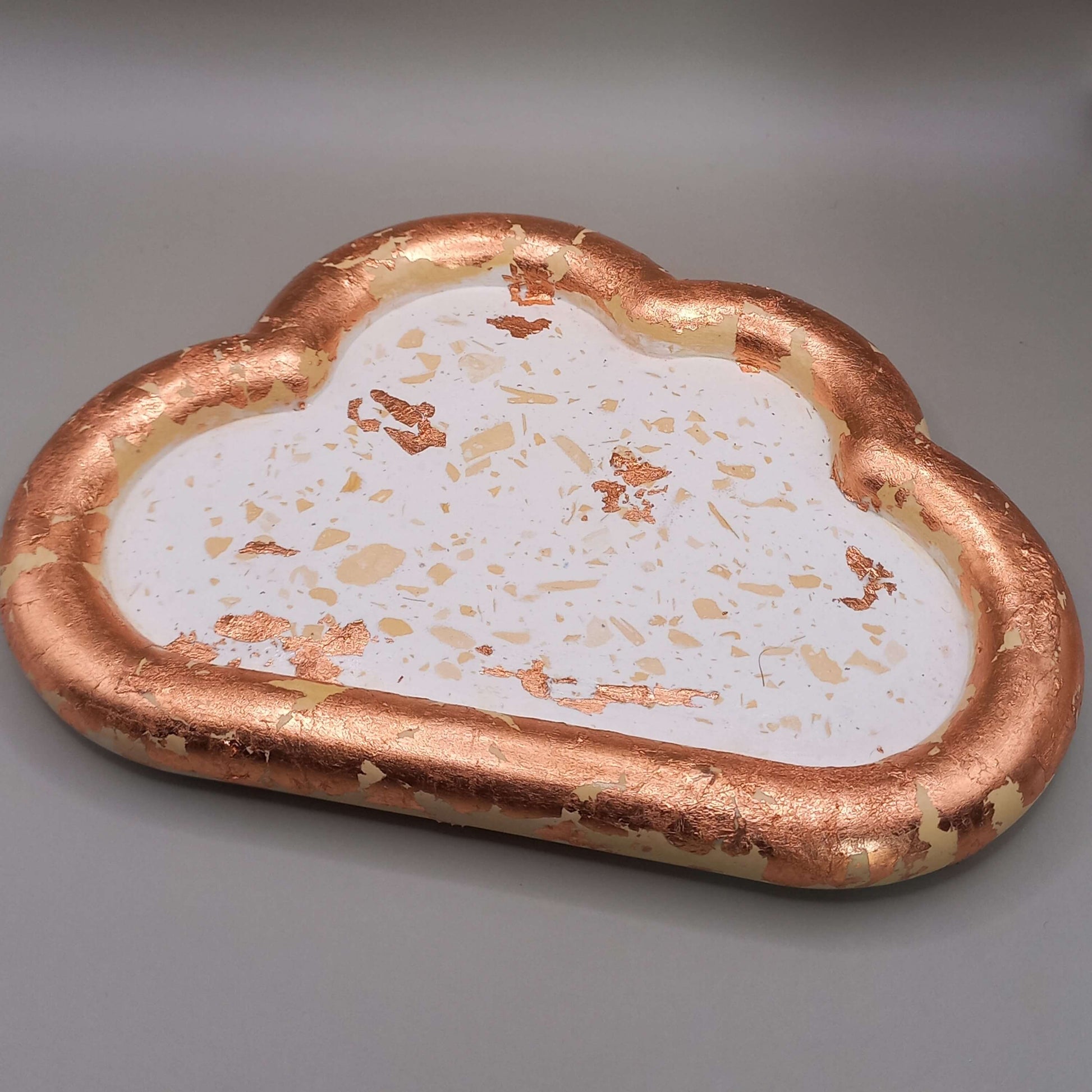 Χειροποίητος τσιμεντένιος δίσκος, σε λευκό χρώμα, με κίτρινες λεπτομέρειες (τύπου μωσαϊκό) & φύλλα χαλκού.