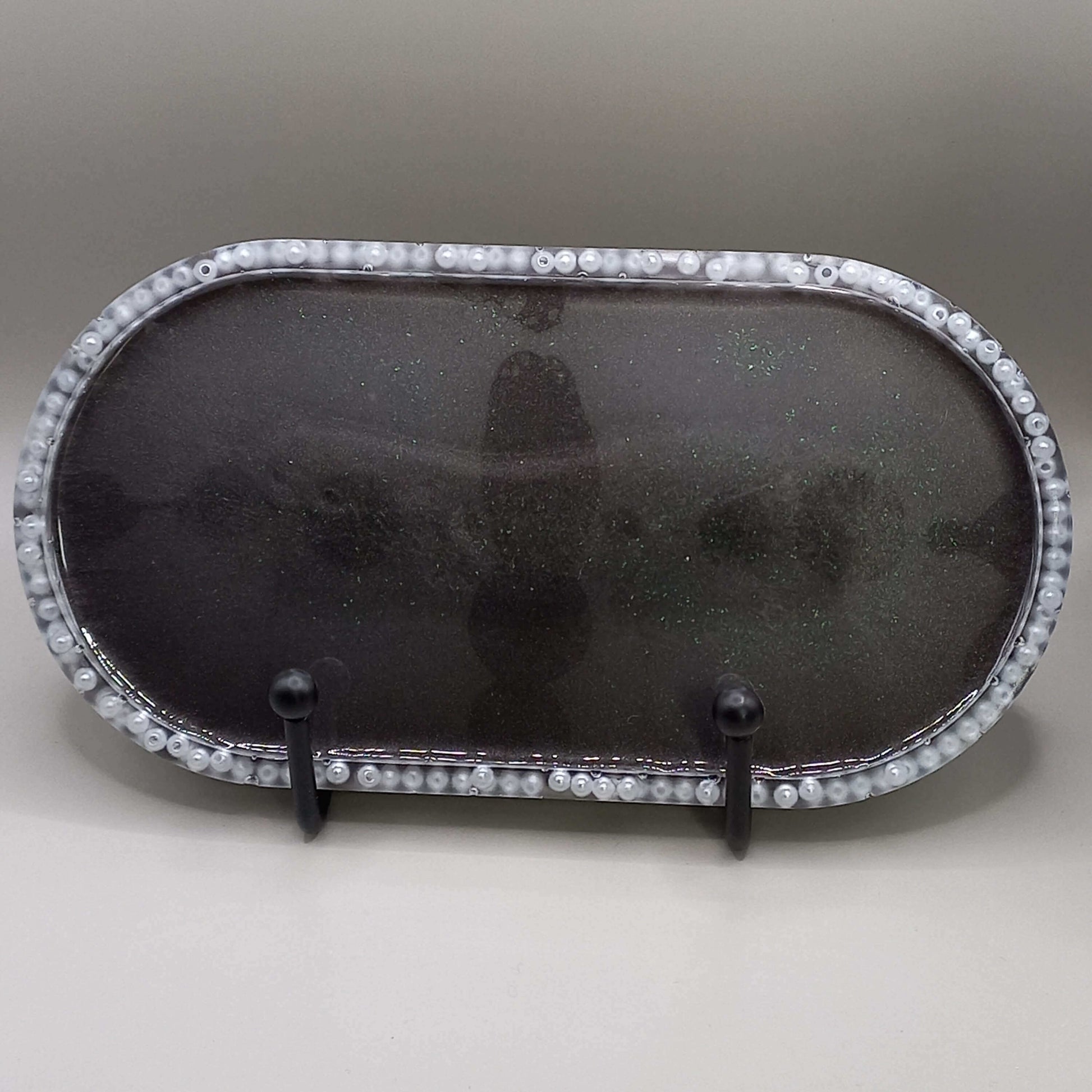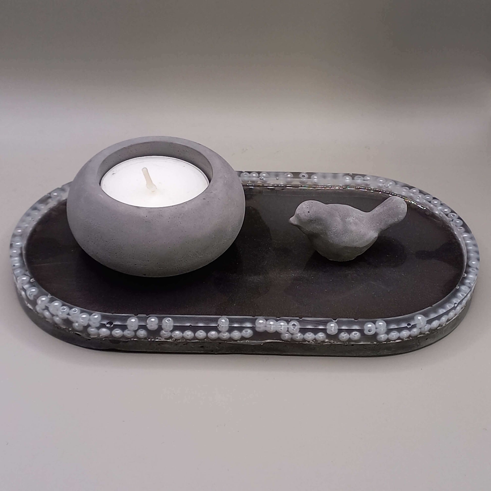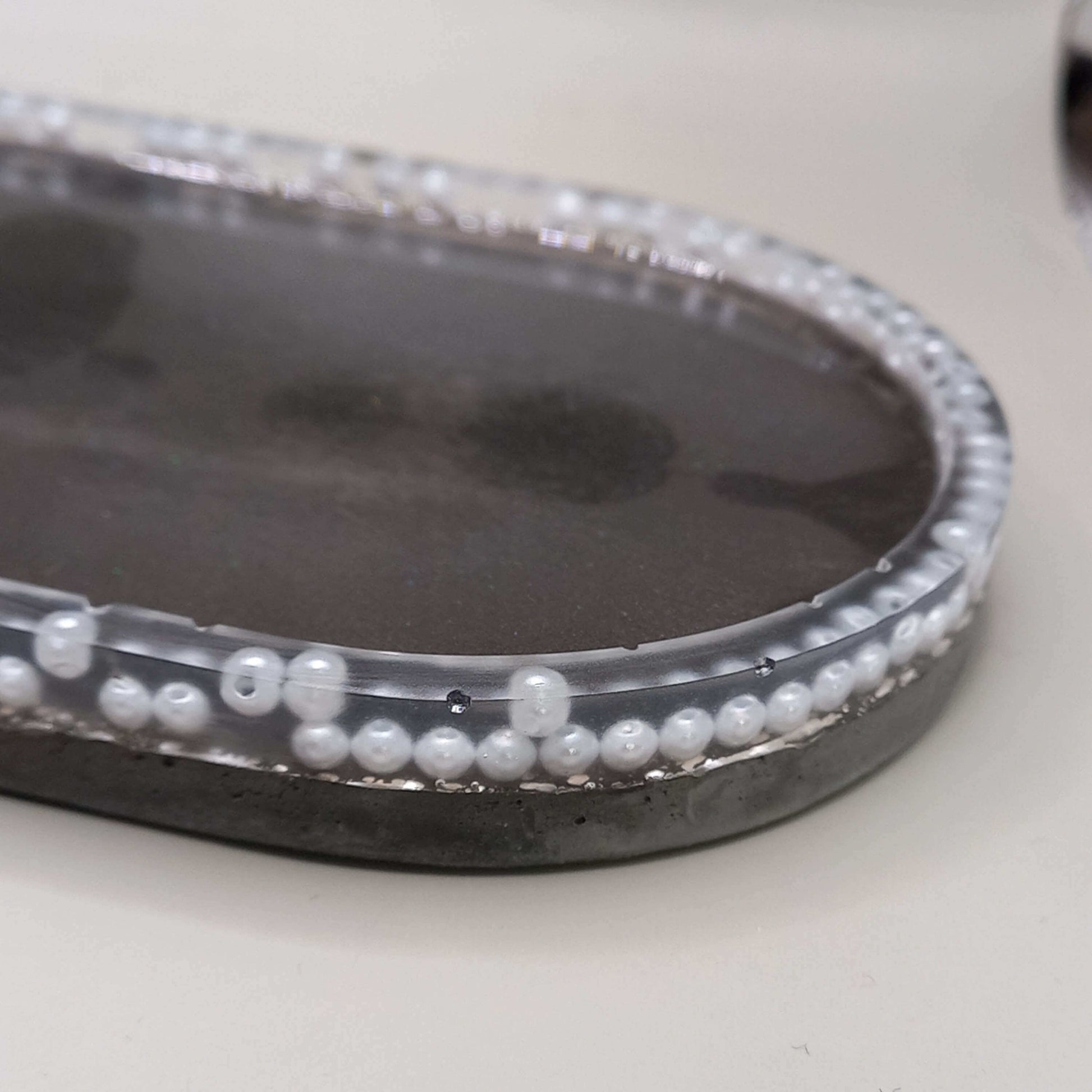 Χειροποίητος δίσκος, σε συνδυασμό εποξικής ρητινής (υγρό γυαλί, μέσα στο οποίο έχουν τοποθετηθεί λευκές χάντρες) & τσιμέντου (σε σκούρο γκρι χρώμα-ανθρακί).