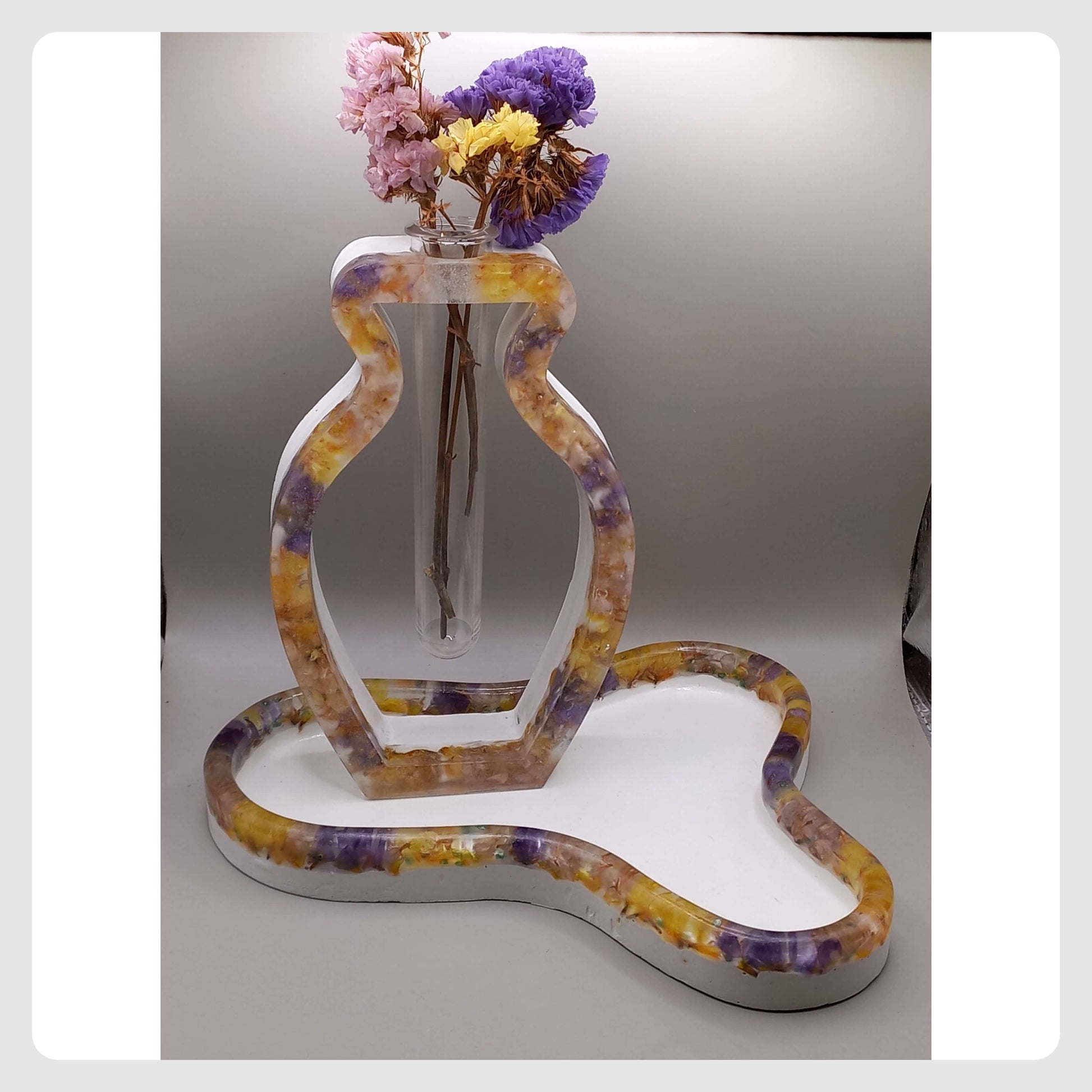Περιμετρικά, αποξηραμένα λουλούδια μέσα σε υγρό γυαλί.