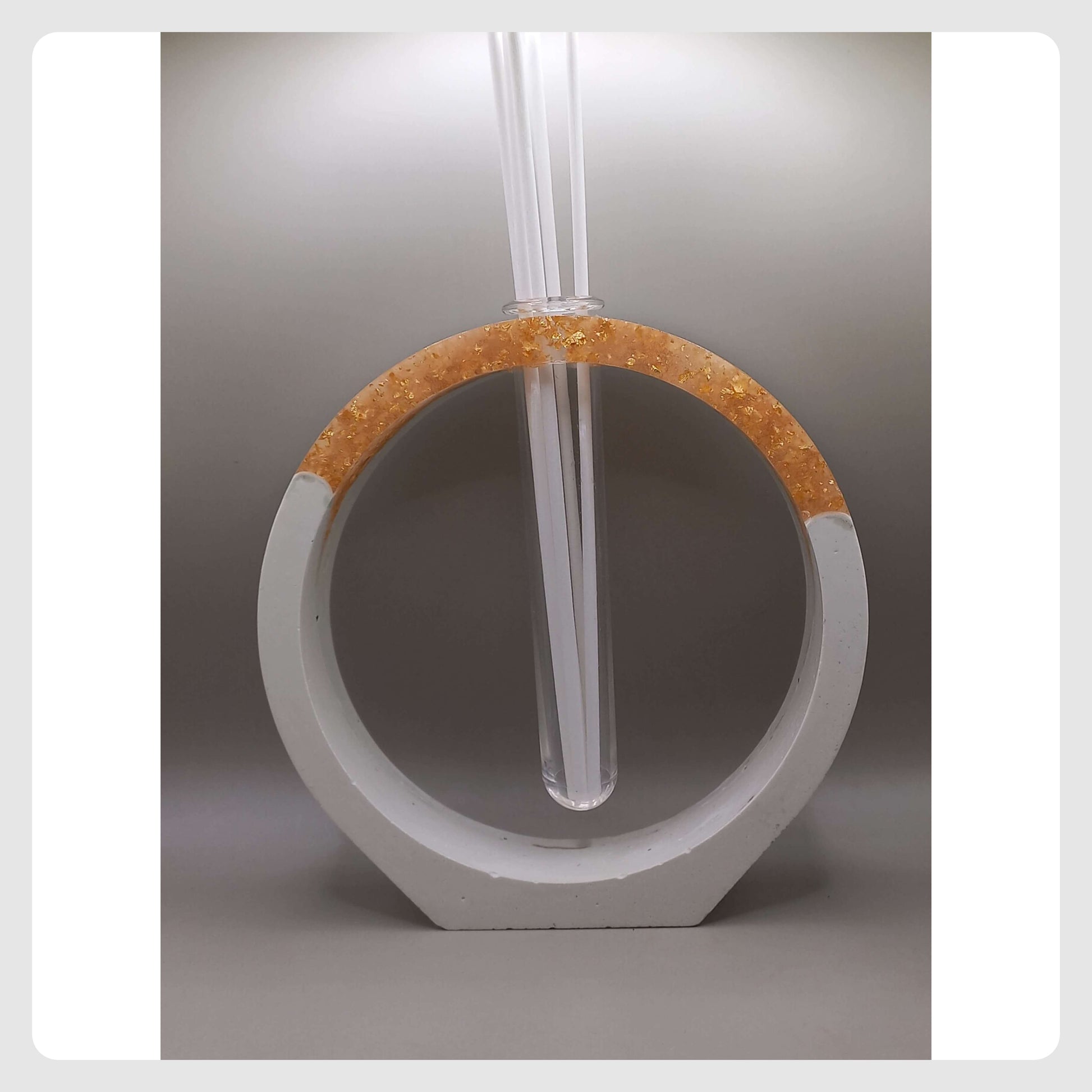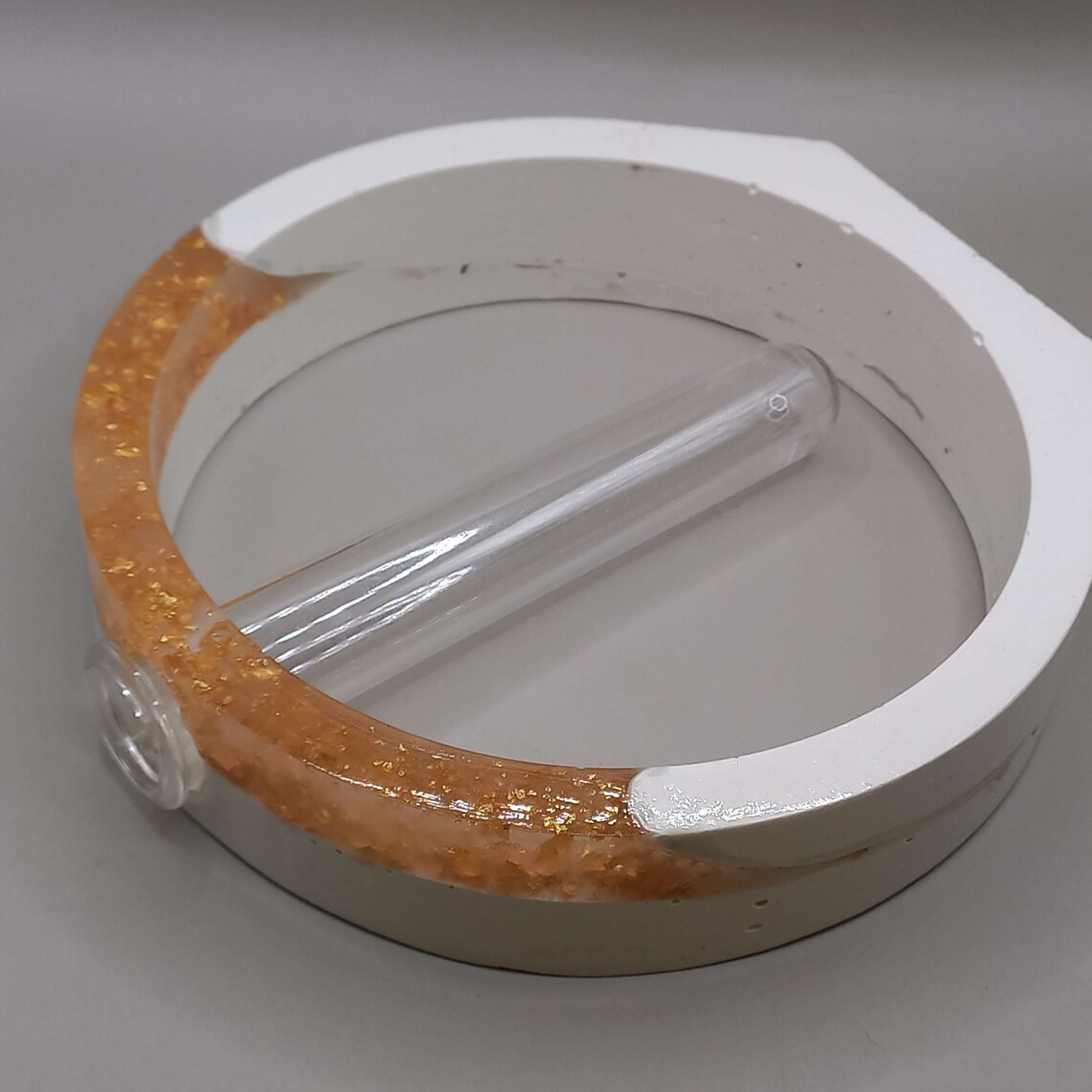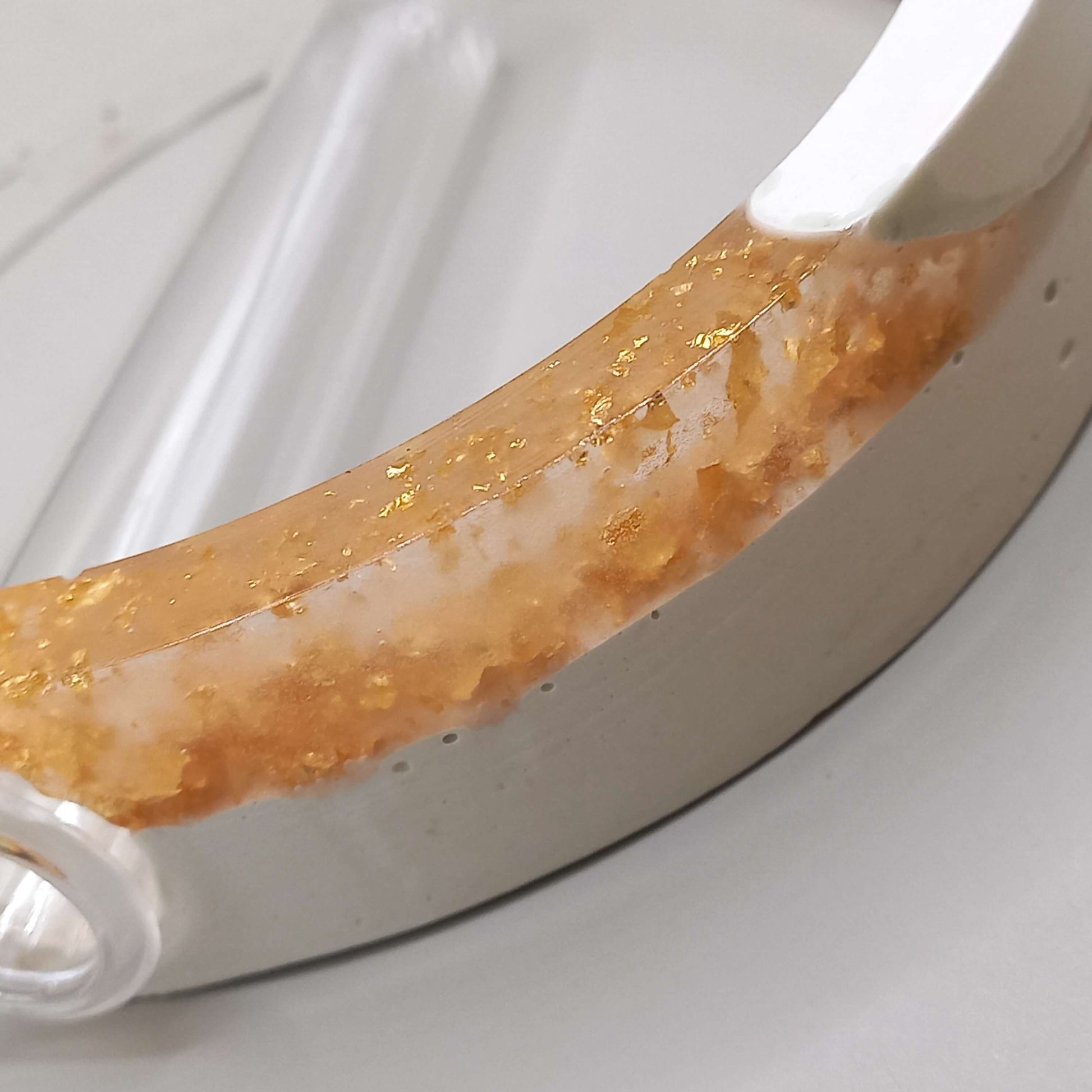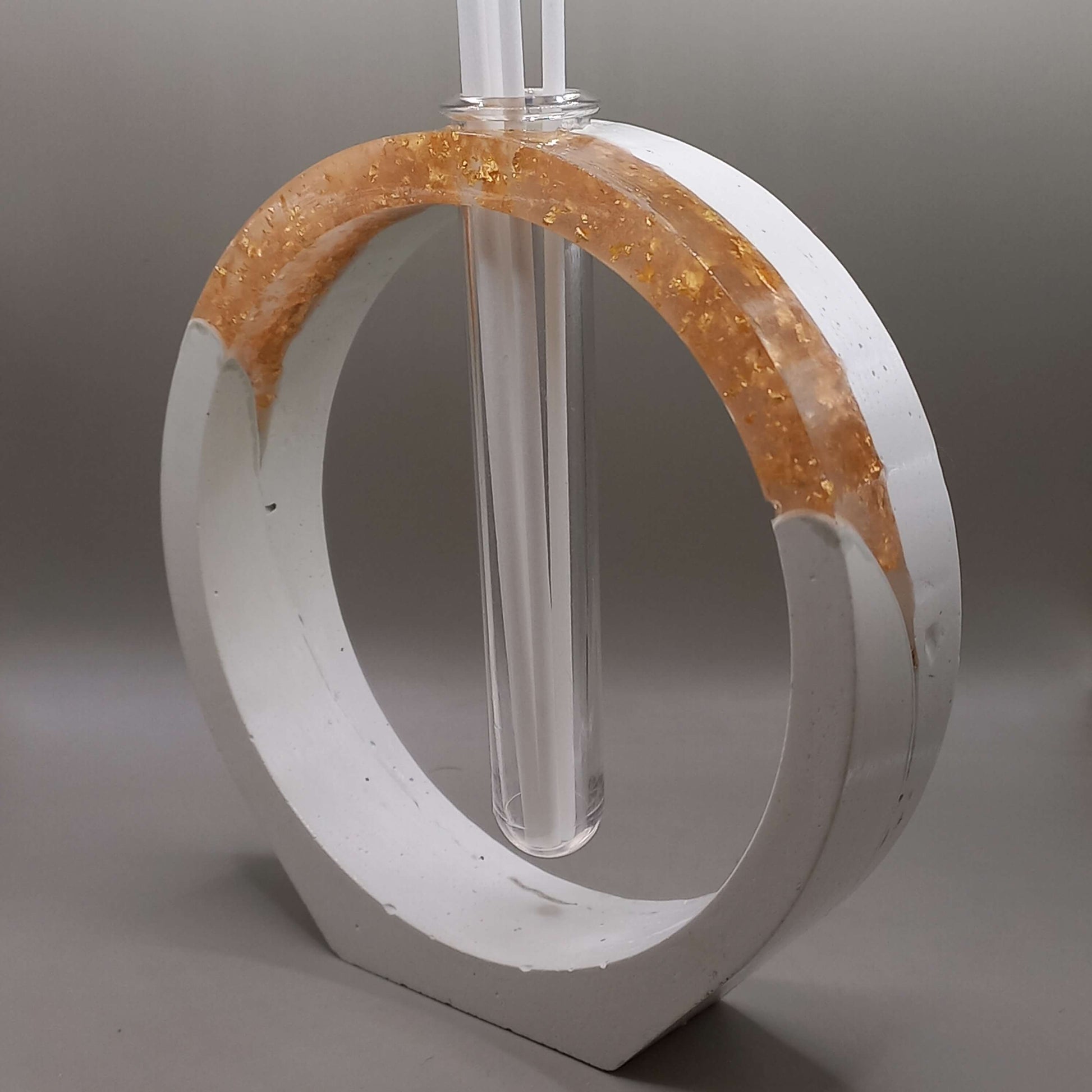 Χειροποίητο τσιμεντένιο βάζο στρογγυλό, σε λευκό χρώμα με φύλλα χρυσού και υγρό γυαλί.