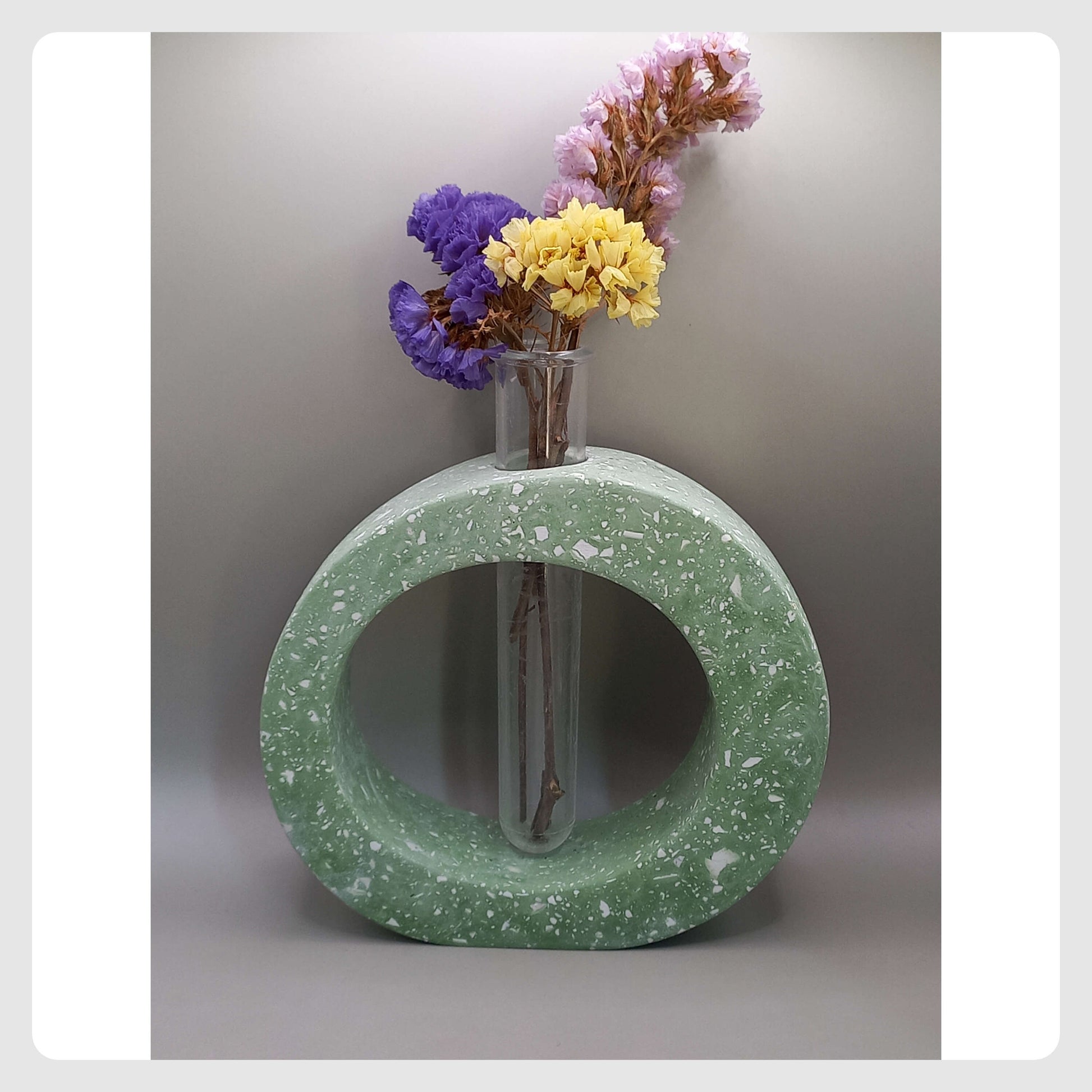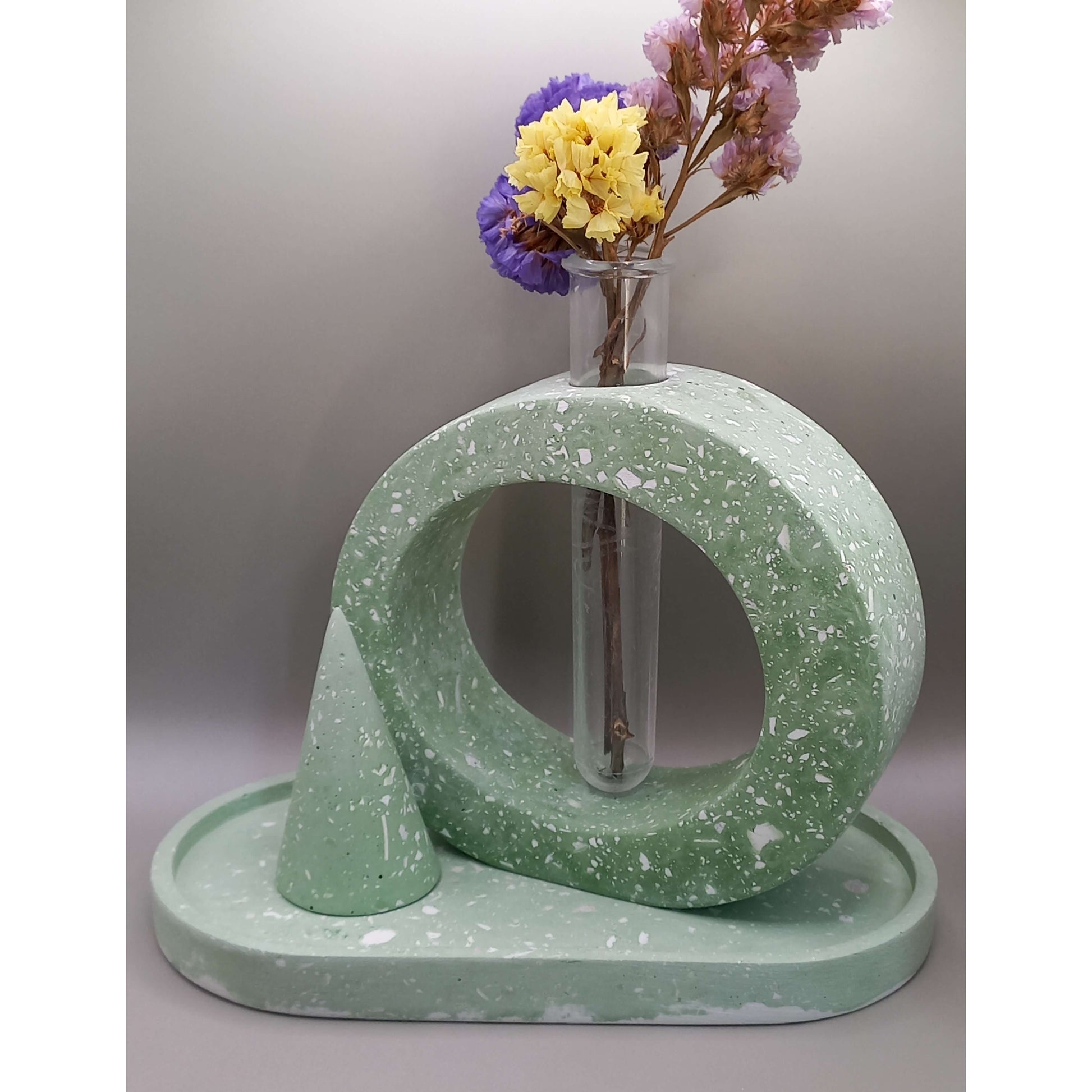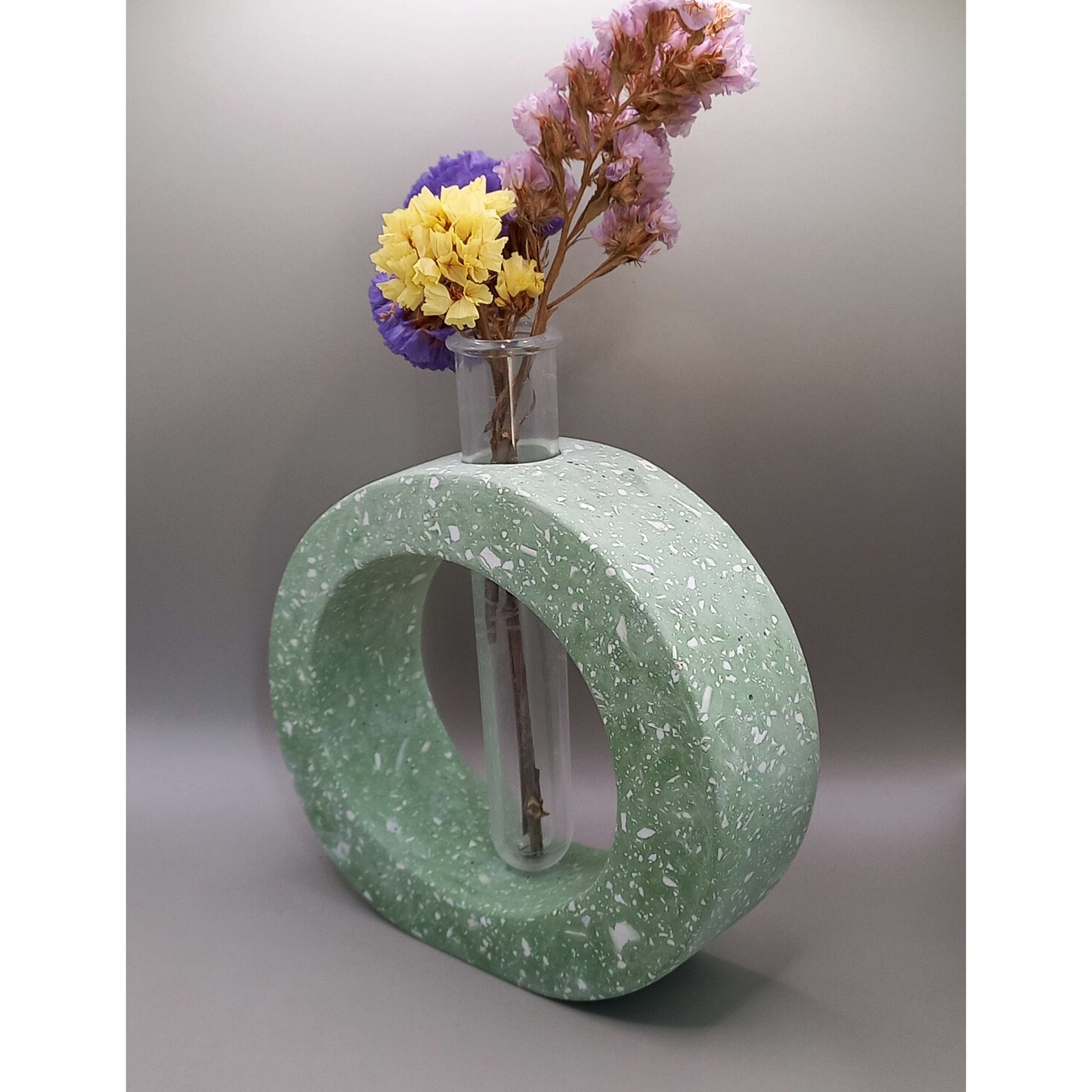 Χειροποίητο τσιμεντένιο βάζο ελλειψοειδές. Σε πράσινο χρώμα με λευκές λεπτομέρειες (τύπου μωσαϊκό).