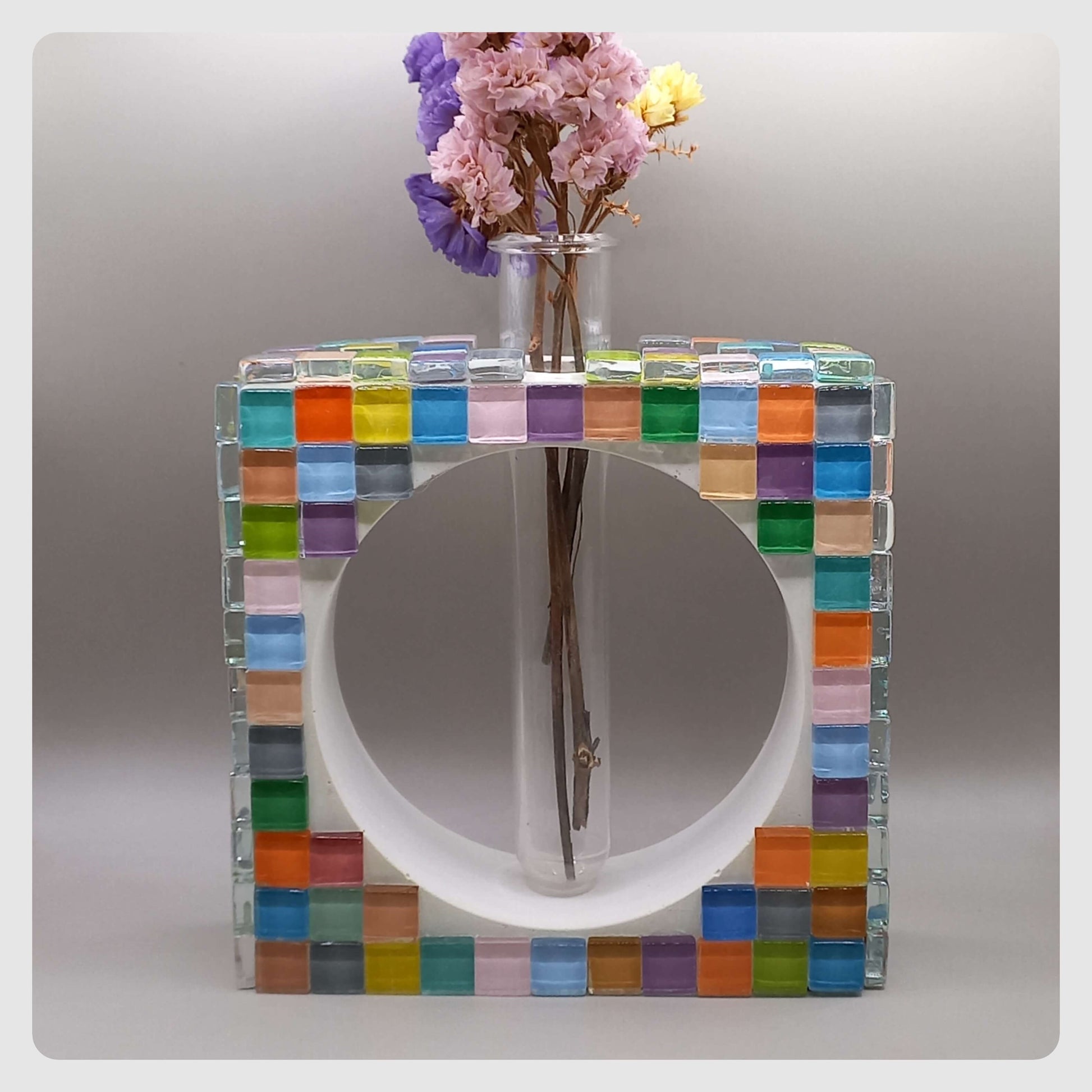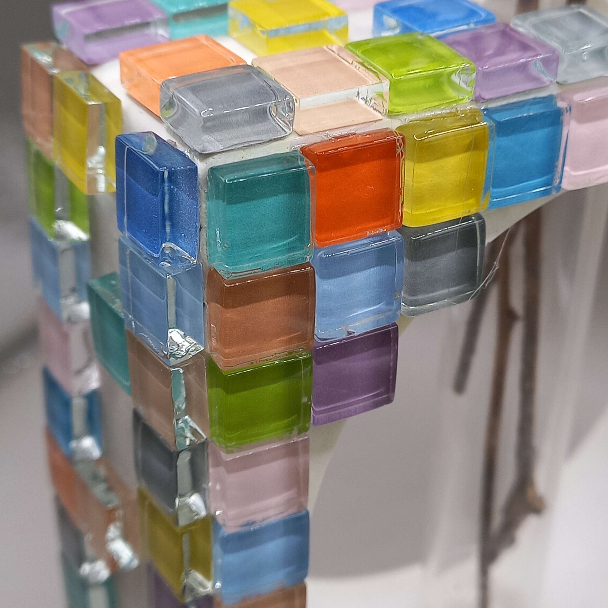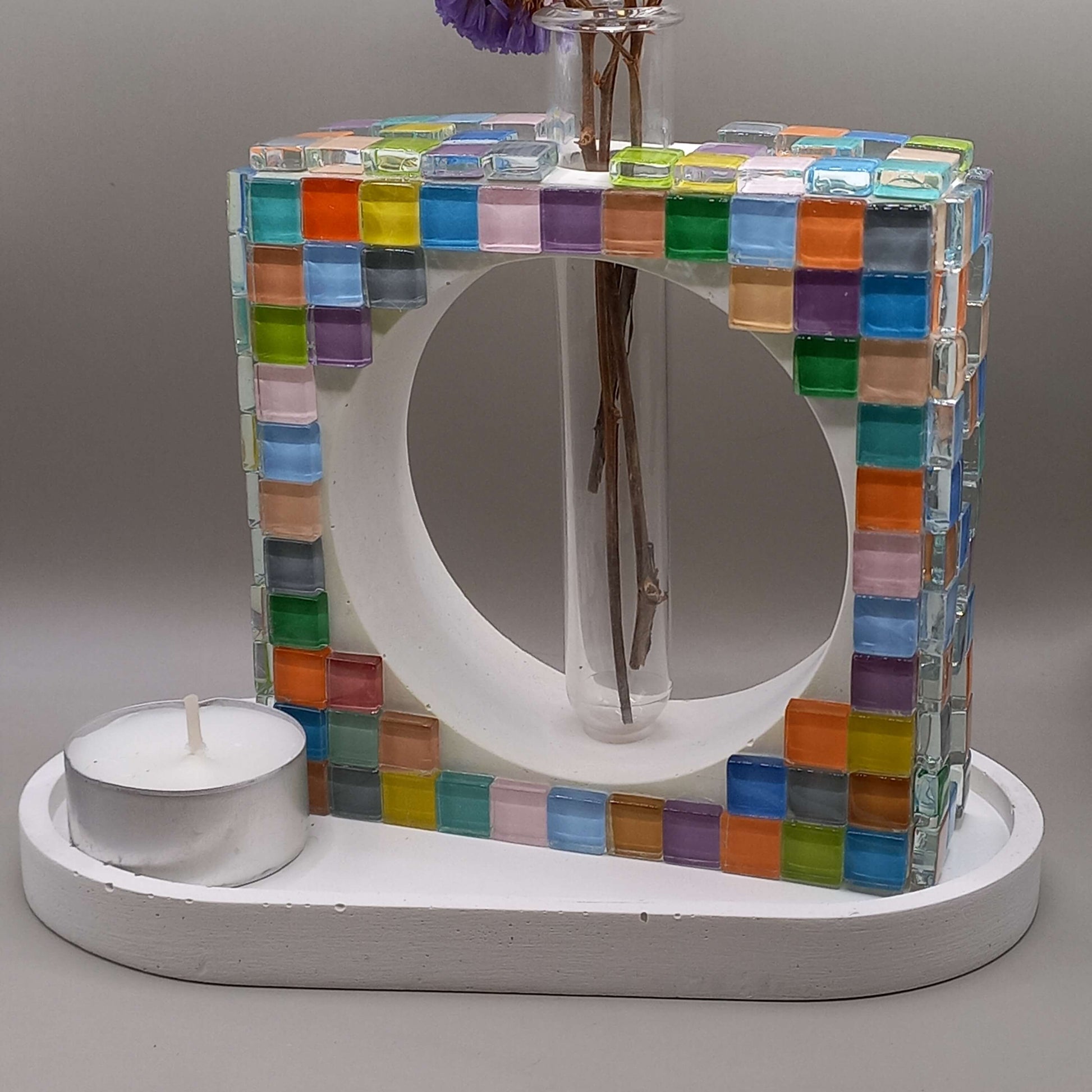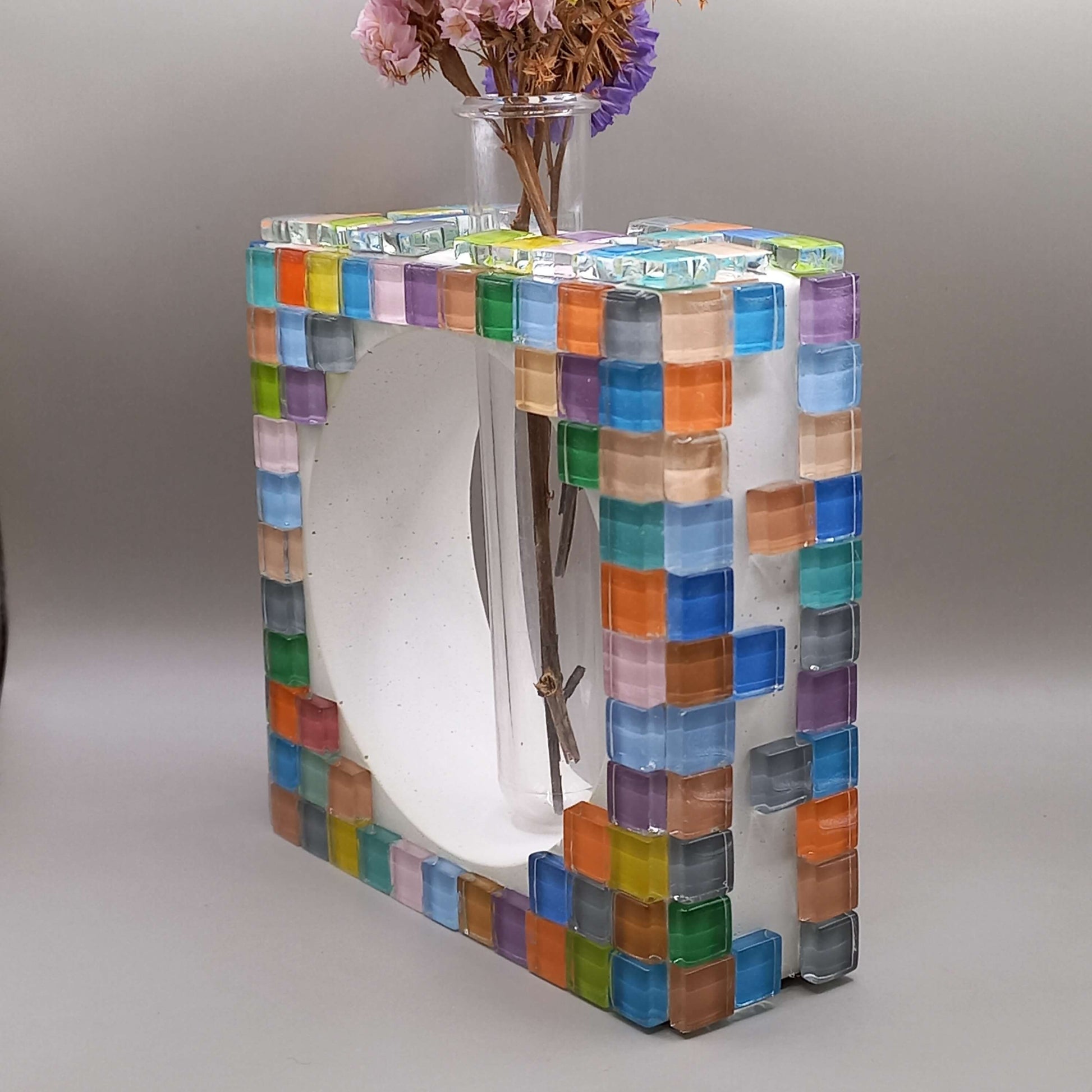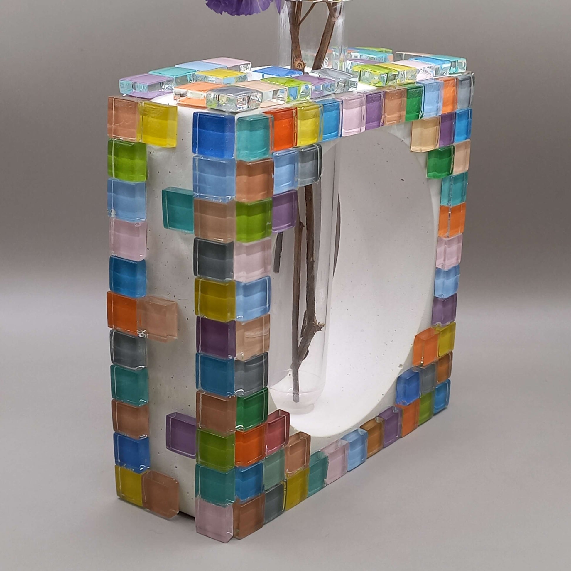 Χειροποίητο τσιμεντένιο βάζο, τετράγωνο. Σε λευκό χρώμα, με γυάλινες χρωματιστές ψηφίδες.
