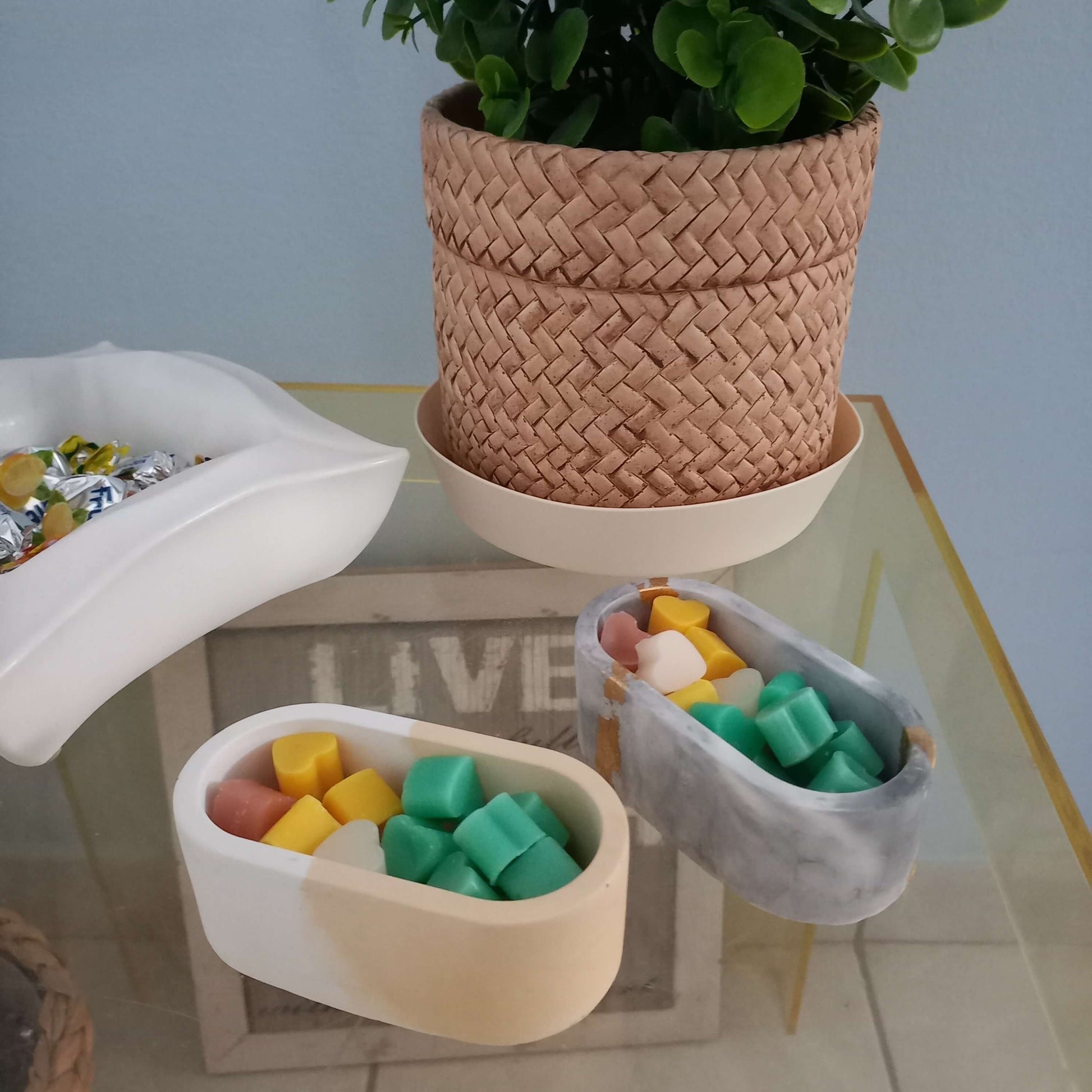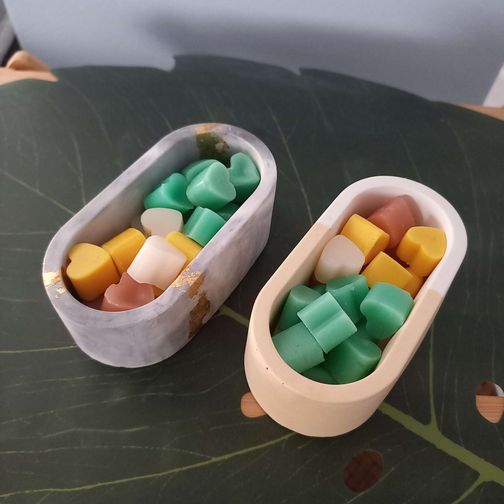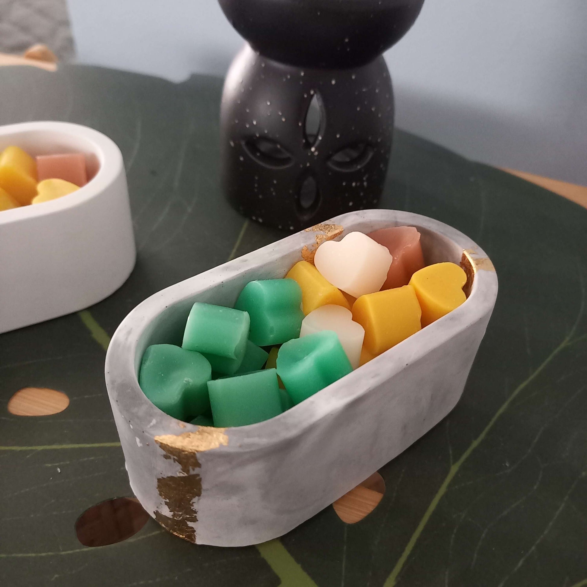 Χειροποίητα οβάλ δοχεία, γεμάτα με wax drops σε σχήμα καρδιάς.